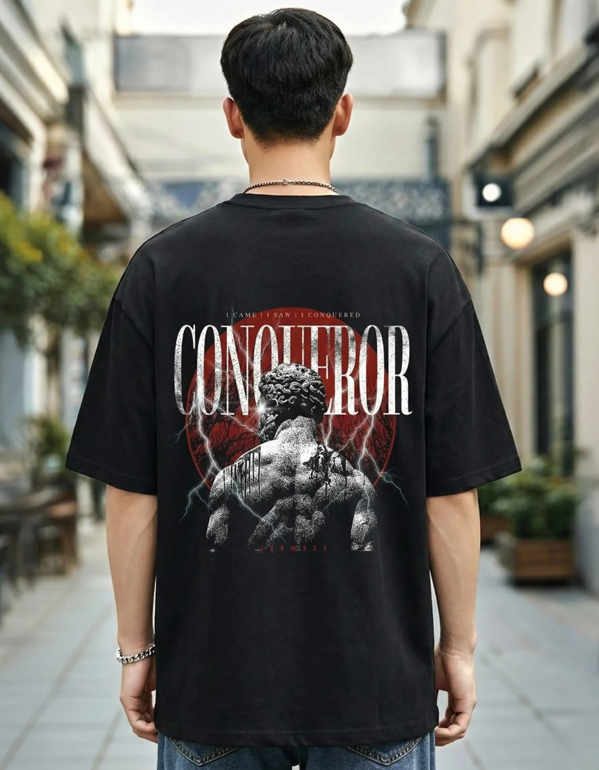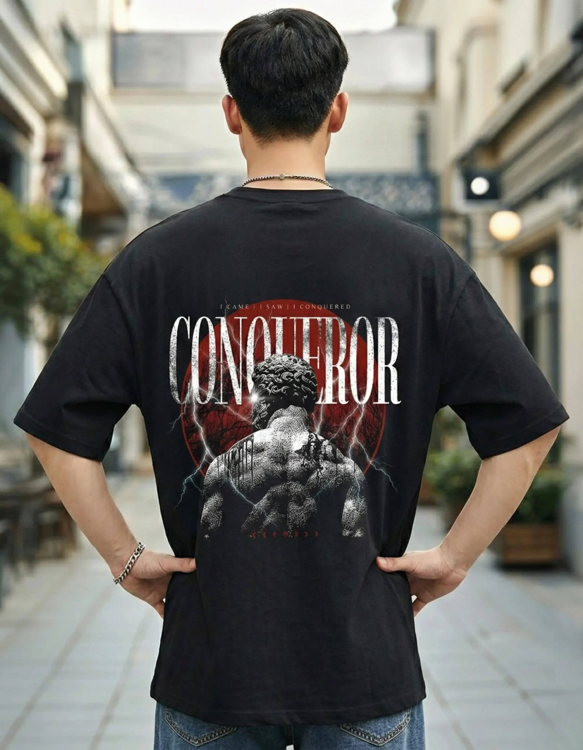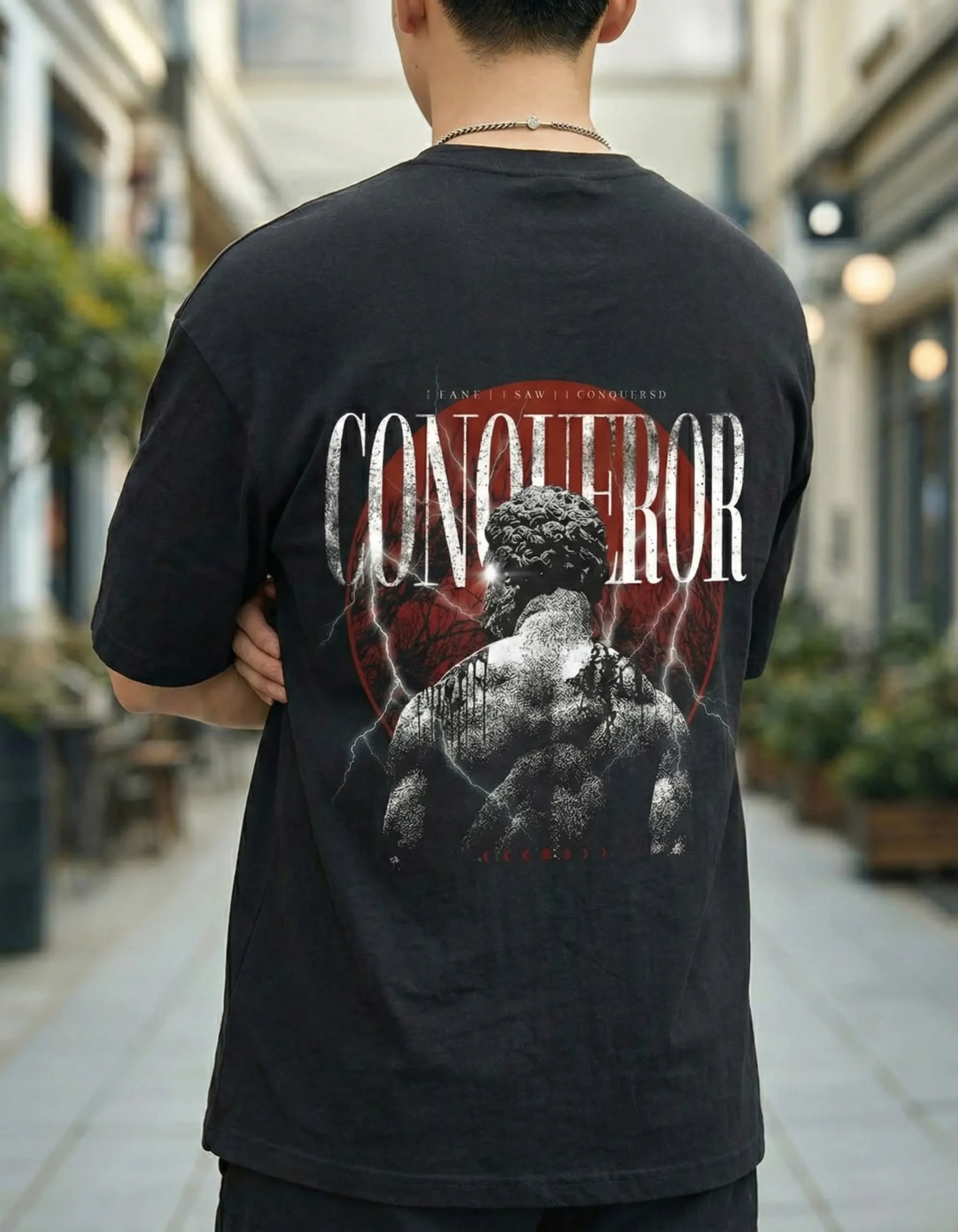 The back features a striking graphic of a powerful Roman-style warrior statue with lightning and a bold red circular backdrop. The word CONQUEROR stands tall across the design, paired with the motivating phrase: