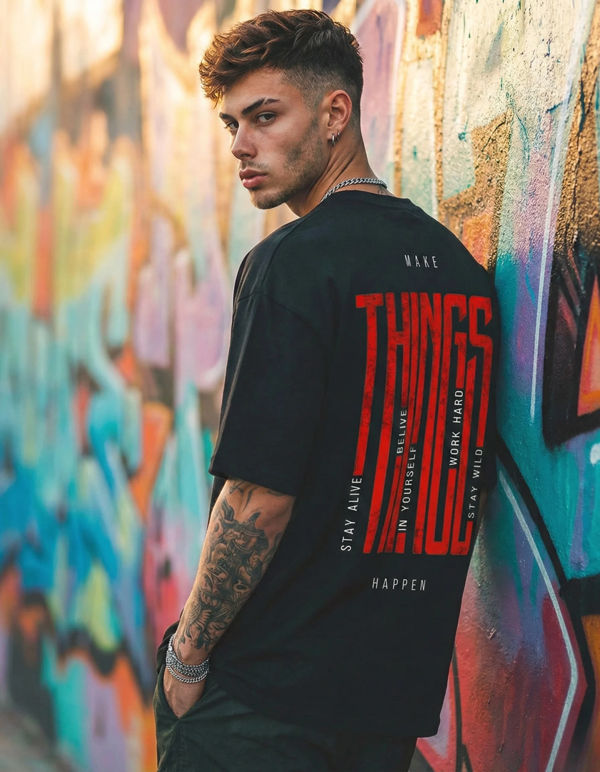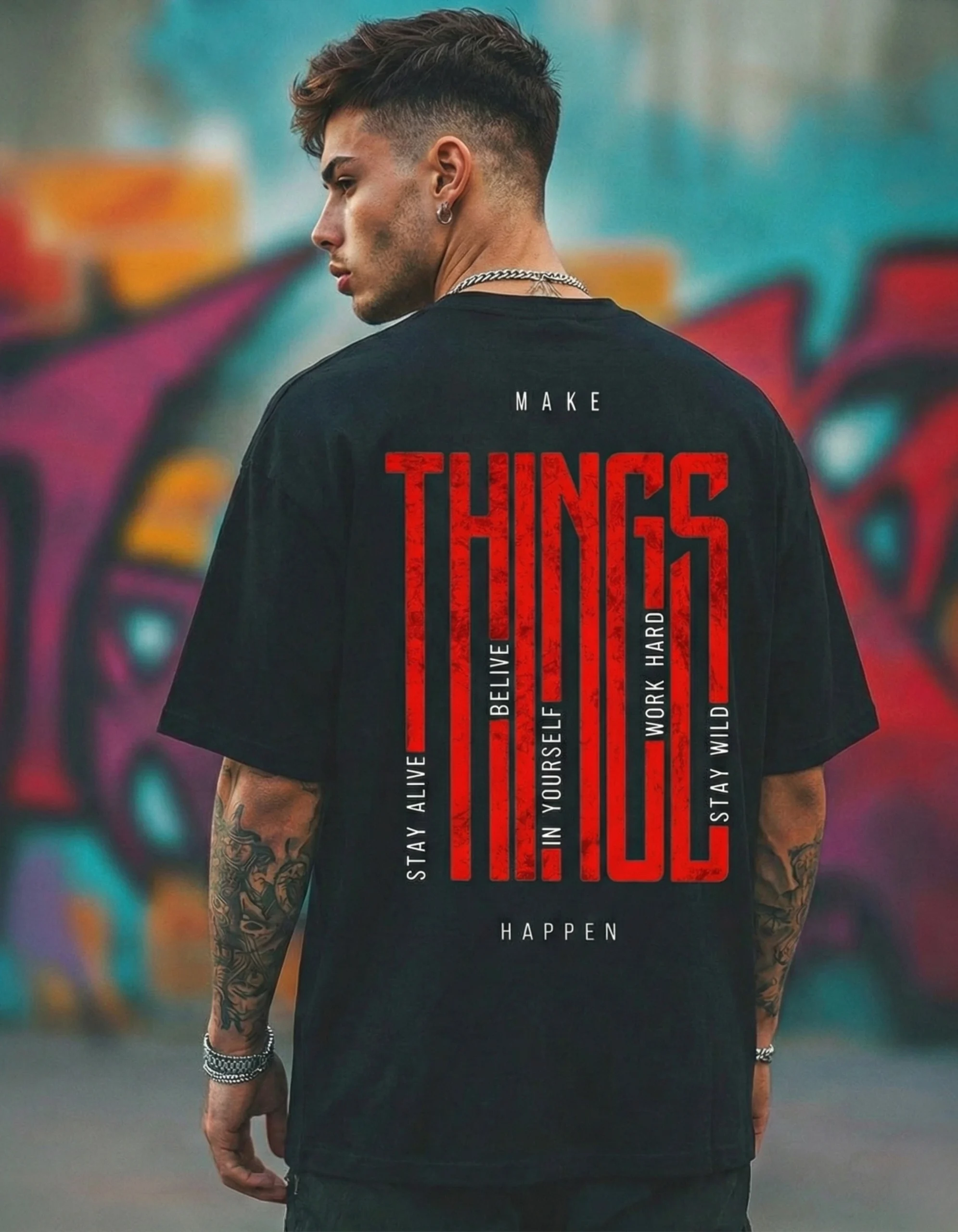 Step into confidence with the Make Things Happen Oversized Black T-Shirt, designed for bold thinkers and action-takers. Featuring a striking red typographic design on a deep black base, this tee blends motivation with modern streetwear aesthetics. The oversized fit offers a relaxed, drop-shoulder silhouette for maximum comfort and effortless style. Crafted from premium, breathable cotton, it’s perfect for daily wear, casual outings, or making a statement wherever you go. This isn’t just a t-shirt—it’s a mindset.